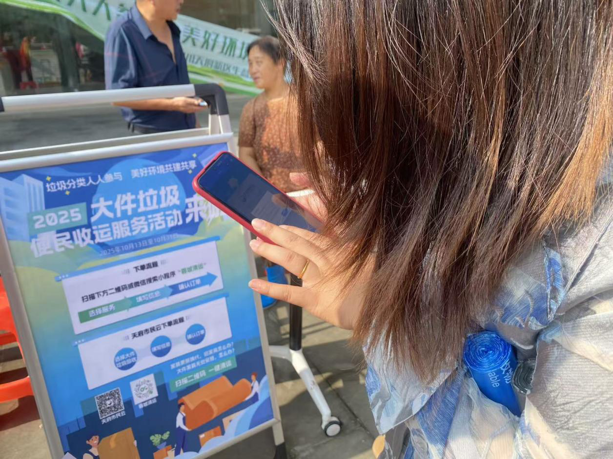 针对老年人不熟悉线上操作的问题,志愿者专门开设“手把手教学岗”。“您看,打开‘天府市民云’APP,搜索‘大件垃圾回收’,按提示填信息就行,我帮您试一次。”志愿者一边操作手机,一边为老人讲解预约步骤。从登录账号到选择服务类型,再到查看订单进度,每一个环节都细致演示,还贴心地在流程图上标注了关键步骤。