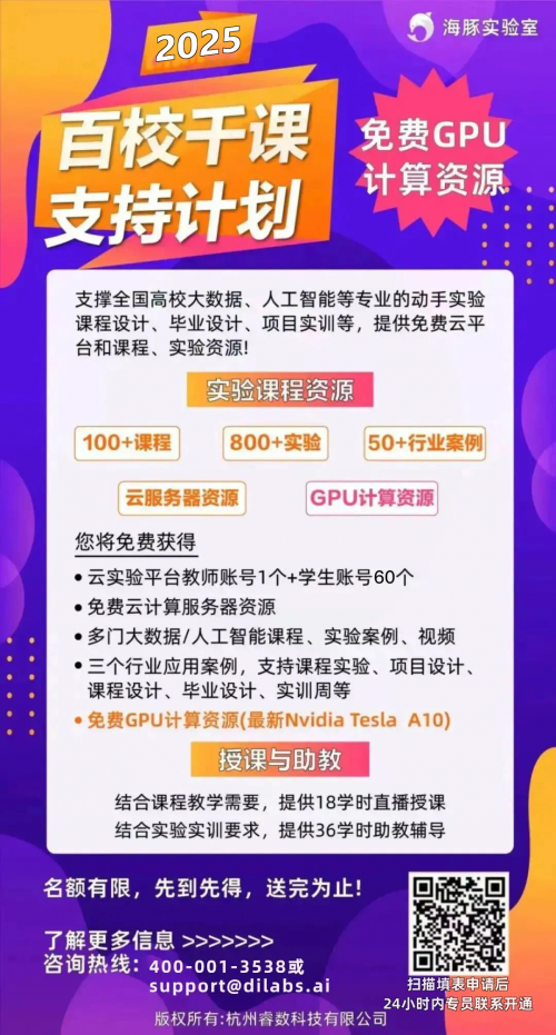 与此同时,杭州睿数科技(海豚实验室)同步推出了“百校千课免费支持”计划,全力为推进全国高校大数据与人工智能教学发展贡献力量,欢迎老师们致电咨询️。
