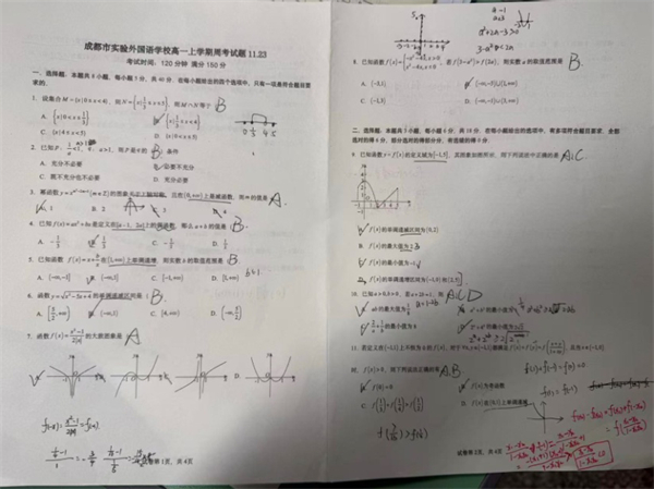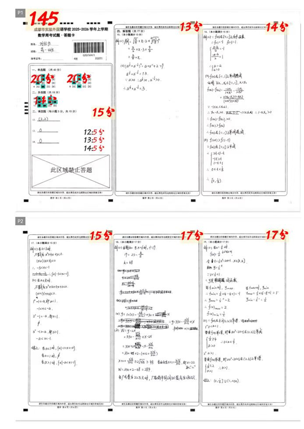 在成都实验外国语学校的高一综合考试,刘欣怡以145分的高分,在年级数学成绩排名中名列前茅。