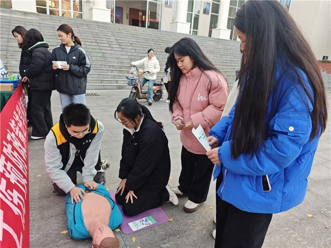 实操体验环节将工伤预防知识从理论层面推向了实践层面。在专业指导下,同学们轮流上阵,通过模拟触电体验仪直观感受违规用电的危害,学习心肺复苏的关键技巧,练习如何为伤员进行创伤包扎,在亲身体验中掌握了必要的应急技能。