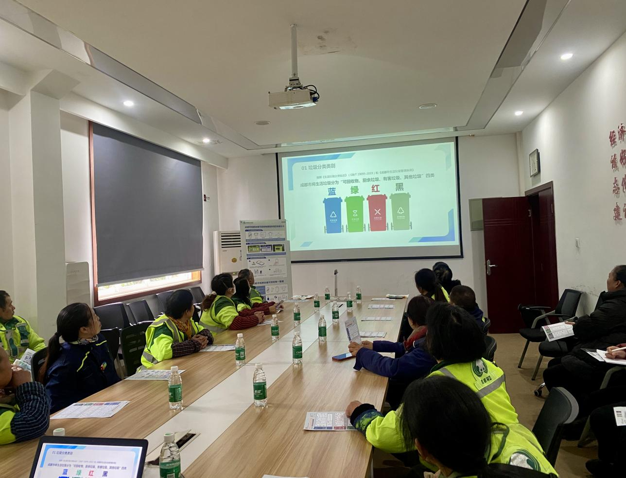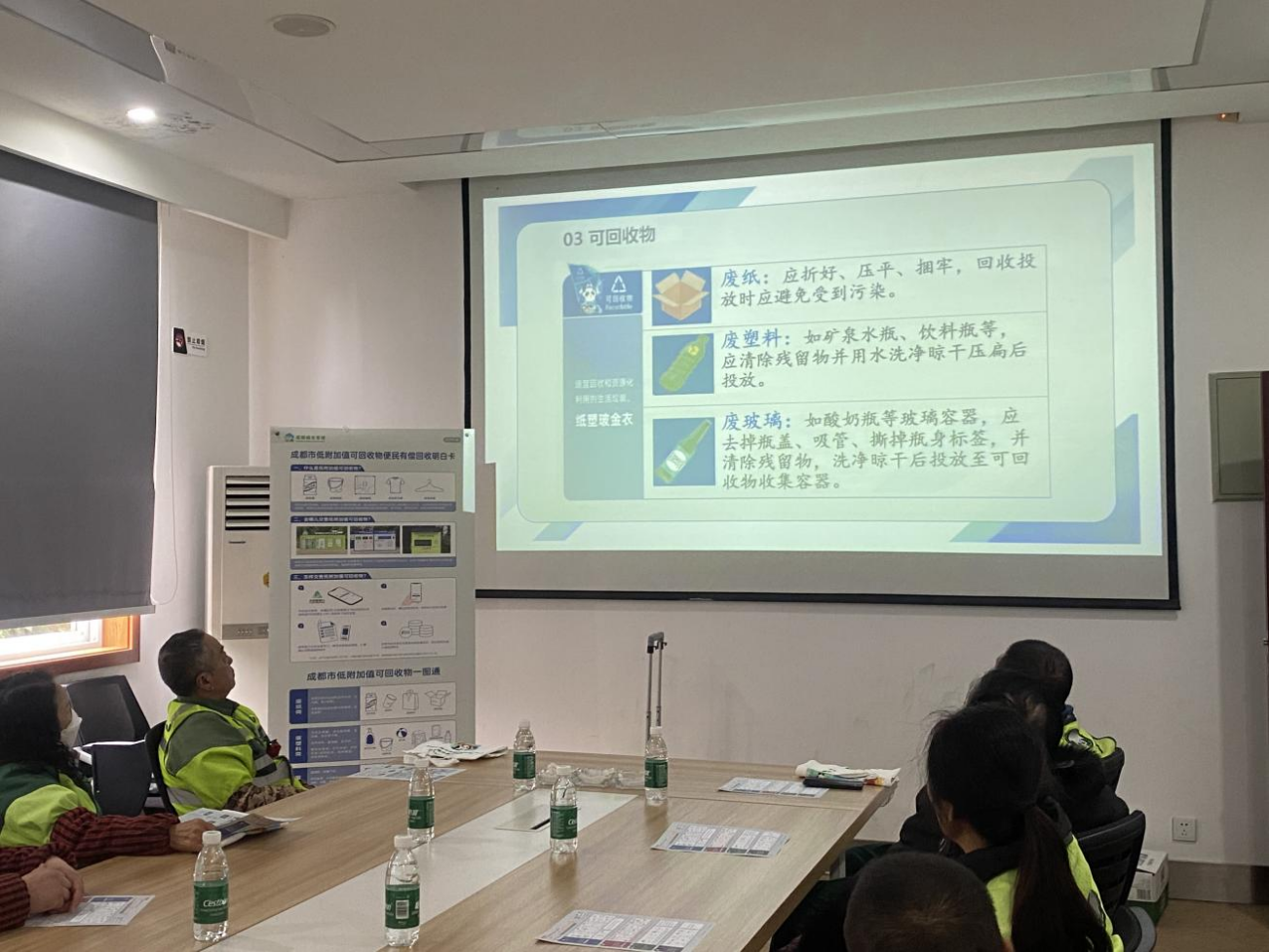 培训中,工作人员带领大家重温生活垃圾四分类划分标准,强调各类生活垃圾的核心定义与处理原则,着重讲解了可回收物知识,明确可回收物的定义和资源化利用价值,梳理出纸类、塑料、金属、玻璃、织物、电子废弃物六大类可回收物的分类框架,让环卫工作者对可回收物范畴有了清晰的认知。同时,结合图片与实际案例,逐一讲解每类可回收物的识别特征,帮助大家快速掌握常见可回收物的辨别方法。